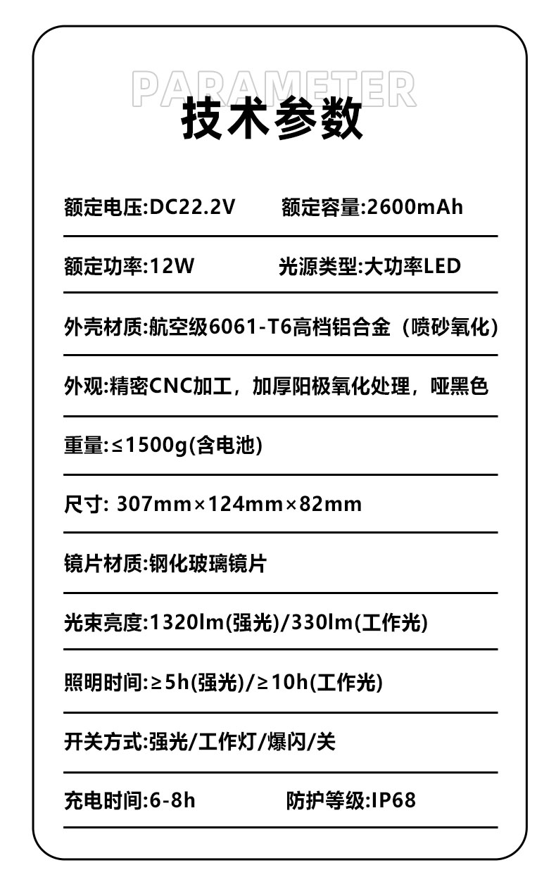 额定功率:12W;工作时间:≥5h(强光)/≥10h(工作光)